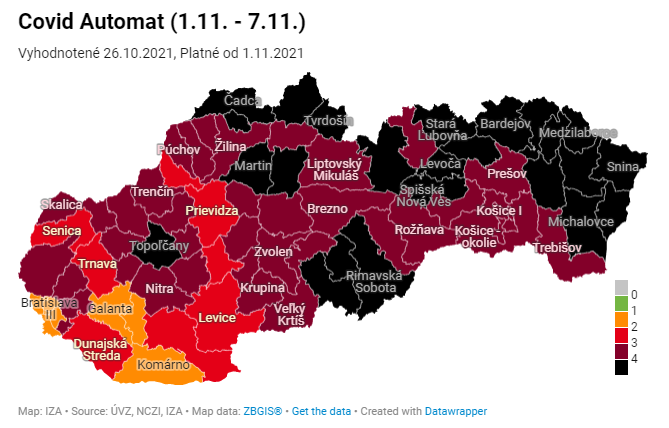 Od pondelka 1. novembra bude na Slovensku v čiernej farbe 24 okresov. V druhom stupni ohrozenia, teda v bordovej fáze, bude 39 okresov. Červených okresov bude osem, rovnako bude osem okresov oranžových, teda v stupni ostražitosti.