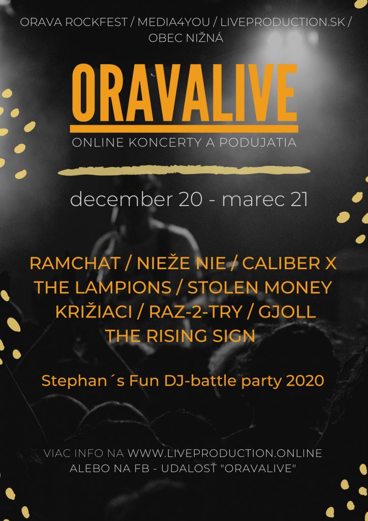 Doposiaľ svoju účasť na ORAVALIVE potvrdili KRIŽIACI, alternatívni RAZ-2-TRY, nordic-folkové zoskupenie GJOLL, punkové formácie THE LAMPIONS a NIEŽE NIE, progresívne metaloví CALIBER X, indie/art rockeri THE RISING SIGN, blues rockový STOLEN MONEY a aj obľúbená pagan/blackmetalová kapela RAMCHAT, ktorá po prvý raz koncertne predstaví albumovú novinku Znelo lesom. Taktiež nebude chýbať ani elektro-scéna v podaní DJ MiH, Dj Majkl, DJ Robbie O., DJ Stylo a v rámci štefanskej akcie s názvom - Stephan´s Fun DJ-battle party 2020.