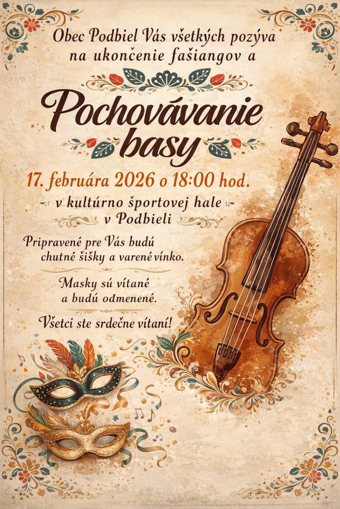 Obec Podbiel vás pozýva na ukončenie fašiangov a pochovávanie basy, ktoré sa uskutoční v utorok 17. februára so začiatkom o 18.00 hodine v kultúrno-športovej hale v Podbieli. Tešiť sa môžete na šišky a varené vínko. Masky sú vítané a budú odmenené. Všetci ste srdečne vítaní.